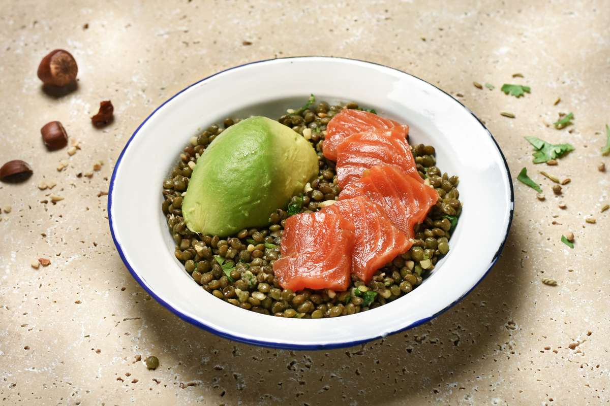 Une salade de lentilles avec un saumon gravlax maison qui s'associe à merveille avec l'avocat ! Sain et délicieux, tout ça avec un saumon élevé naturellement en pleine mer !