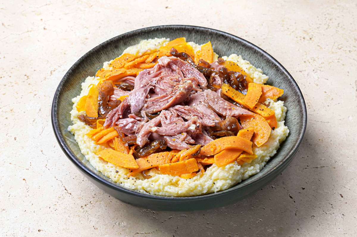Un somptueux jarret de porc rôti dans nos fours durant 7 heures accompagné de carottes et d'une polenta archi crémeuse. Un plat gourmand et réconfortant !
