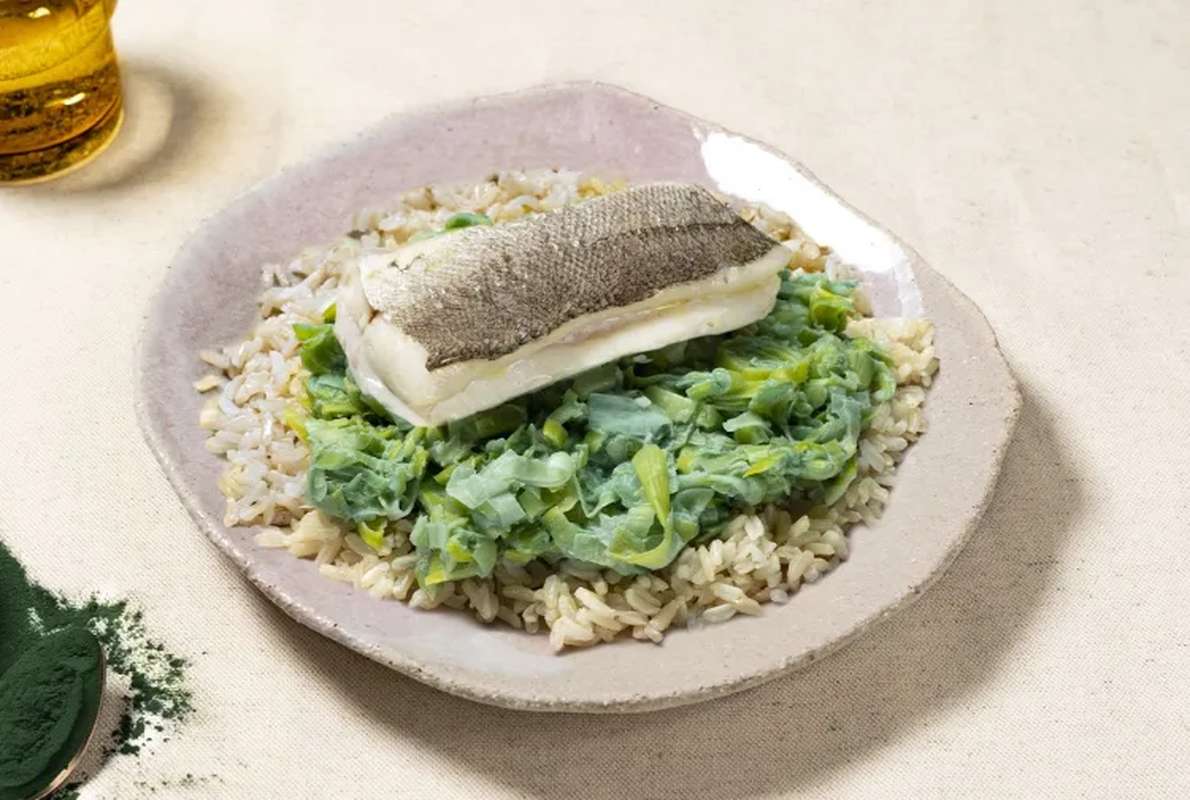 Un beau morceau de Merlu cuit à cœur accompagné d'une fondue de poireaux et de riz thaï. Pour l'assaisonnement double combo, on a ajouté de la spiruline et du gingembre frais. Celui-ci est votre meilleur allié contre la fatigue et vos courbatures musculaires.