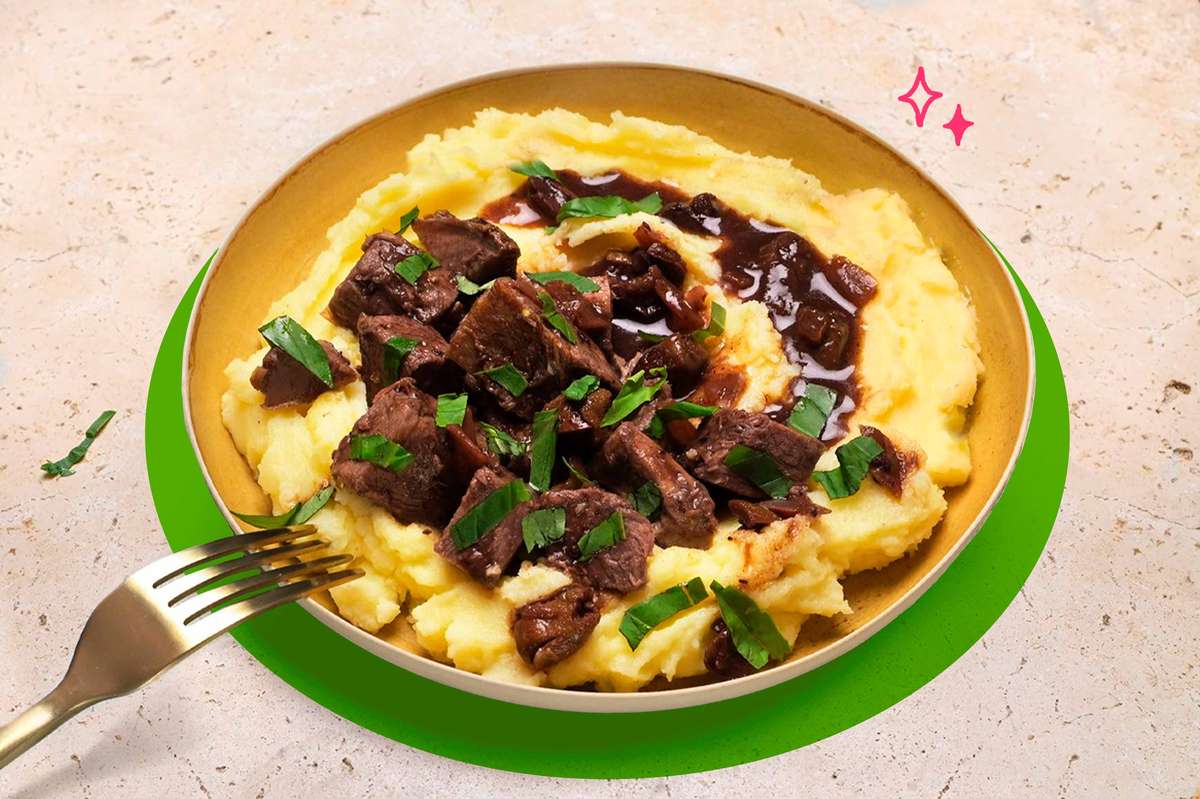 Dédicace à Pierre Augé qui avait imaginé cette recette pour nous en 2016 ! Du bœuf ultra fondant, braisé pendant 4h avec un bouquet garni, une purée maison et une sauce réduite au vin rouge.