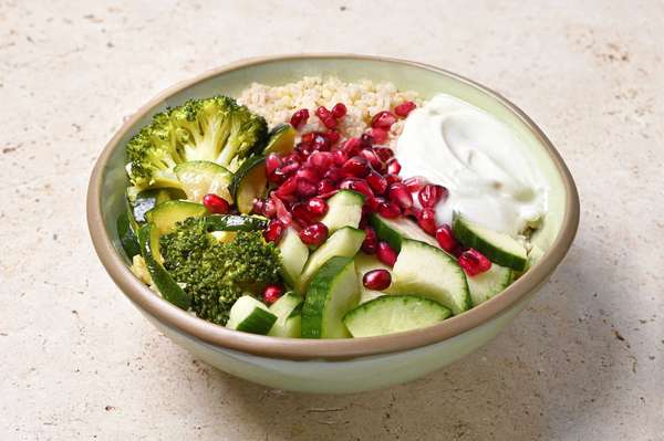 Boulghour (Boulghour, huile végétale, sel fin) - Légumes verts sautés (Courgette, brocoli, huile d'olive, sel, poivre) - Concombre - Sauce au fromage blanc (Fromage blanc (Lait pasteurisé), huile d'olive, jus de citron jaune, miel) - Grenade