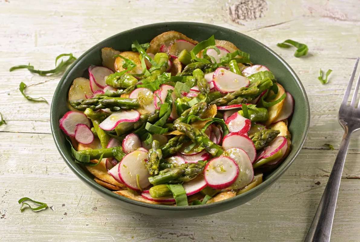 Une salade pour les grands gourmands réalisée à base de pommes de terre rôties au four, mélangé à des asperges fondantes et de radis croquants. Pour ajouter une touche de pep's, notre chef a ajouté de l'ail des ours dans la vinaigrette.