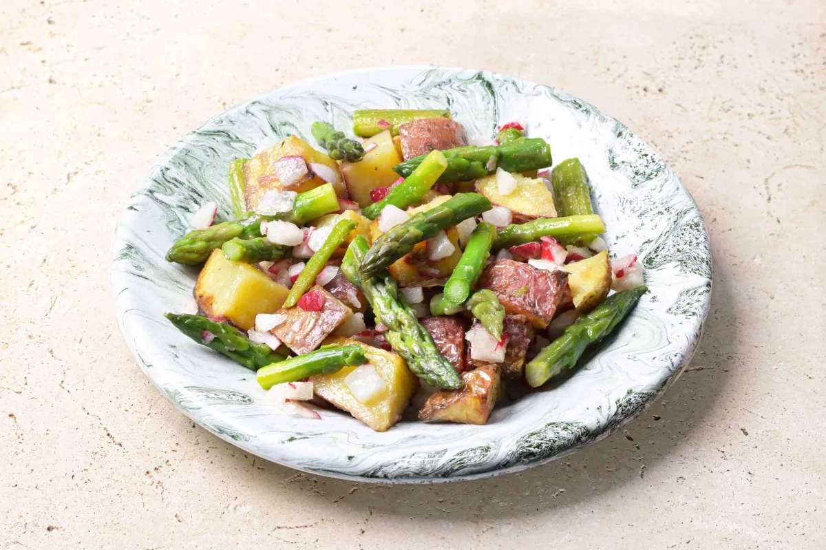Une salade bien fraîche et de saison, avec des pommes de terre roseval fondantes, des asperges vertes françaises, des radis croquants et, pour l'arroser, une vinaigrette aux oignons rouges et au vinaigre de Xérès dont vous nous direz des nouvelles !