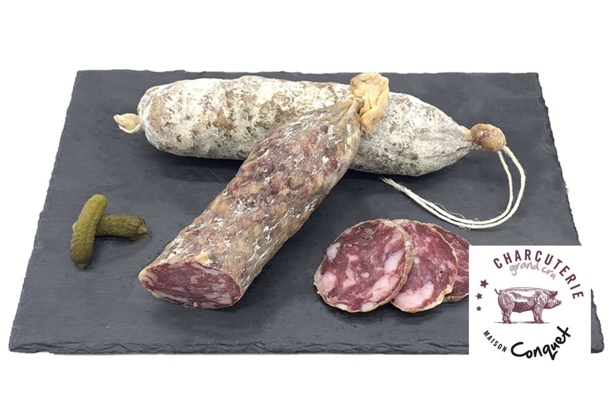 "Saucisson sec grand cru, fabriqué à partir de viande de cochons noirs de races rustiques. Charcuterie persillée de gras et affinée plusieurs mois dans notre séchoir au cœur de l'Aubrac. Pour les amateurs de charcuterie. Maison Conquet, entreprise familiale de bouchers-charcutiers depuis 1950. Passion, traditions, famille et saveurs sont les ingrédients de notre réussite. Toutes nos charcuteries sont fabriquées maison dans notre atelier situé au cœur de l’Aubrac. Héritiers du savoir-faire de nos grands-parents, notre charcuterie offrira à vos papilles un goût d’autrefois. Origine des viandes : France. Vendu sous vide."