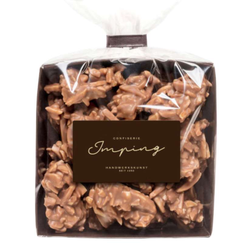 Depuis 1953, la Confiserie Imping, entreprise familiale allemande, émerveille les gourmets avec ses créations. Découvrez leurs éclats d'amandes enrobés de chocolat au lait, un mariage idéal entre le croquant des amandes et la douceur du chocolat. Idéal à savourer après un bon repas avec une tasse de café.