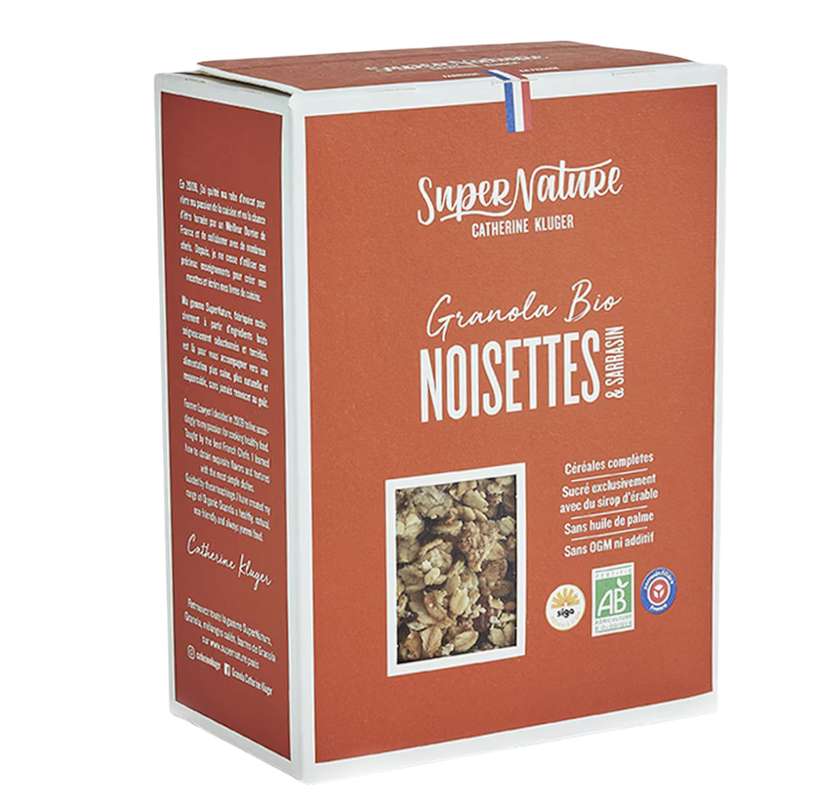 Flocons d’avoine*, graines de sarrasin* (8%), graines de tournesol*, graines de lin*, sirop d'érable*, purée de noisettes* (10%), huile de colza*, noisettes* (5%)