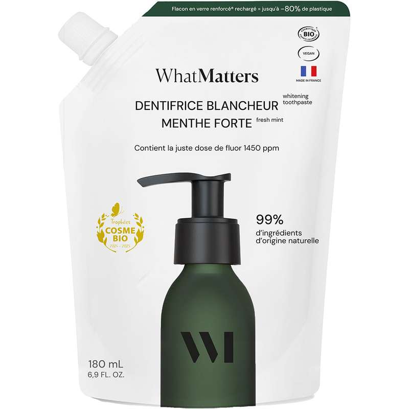 Ce dentifrice menthe certifié bio a tout pour lui : de 7 à 127 ans, il est fait pour vous ! Notée "excellent" sur YUKA et développée avec des dentistes, sa formule naturelle en gel vous laissera l'haleine fraîche et les dents protégées des caries grâce à la juste dose de fluor (1450ppm). Enrichie en poudre naturelle de silice, il luttera contre la plaque dentaire tout en douceur. Cerise sur le gâteau ? Son flacon design est en verre renforcé®, résistant aux chutes, et rechargeable à l'infini !