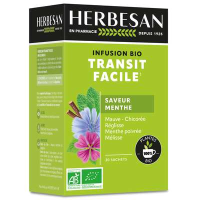HERBESAN®- INFUSION TRANSIT FACILE BIO - Mauve, Chicorée, Réglisse, Menthe poivrée - Saveur Menthe - Frais & Réglissé - Sans plastique- 100% plantes BIO - 20 sachets en papier ✦ Infusion naturellement aromatisée à base de Chicorée Bio qui contribue à un Transit Facile✦Notre experte herbologue, l’oenologue des infusions, vous accompagne dans la dégustation de votre infusion. Découvrez toute sa complexité et appréciez la subtilité et l’intensité de ses saveurs. ✦ À L’OEIL, Robe brillante et limpide jaune doré.✦AU NEZ, Franche et intense, très menthée, mentholée et réglissée.✦ EN BOUCHE, Note de tête : attaque menthée et végétale.Note de coeur : laisse place à un coeur riche mêlant des notes végétales menthées et mentholées à des nuances réglissées et zestées.Note de fond : la note réglissée se déploie plus intensément en longueur offrant une impression à la fois aromatique et sucrée.