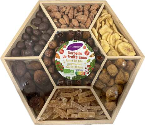 Vendu en colis de Un mélange ultra gourmand de 7 fruits secs dans un joli coffret bois à poser directement sur votre buffet pour les fêtes. Composition : Gingembre confit au chocolat noir Gingembre bâtonnet Amande caramélisé Banane chips Abricot sec Datte Deglet Nour Figue Calabacita