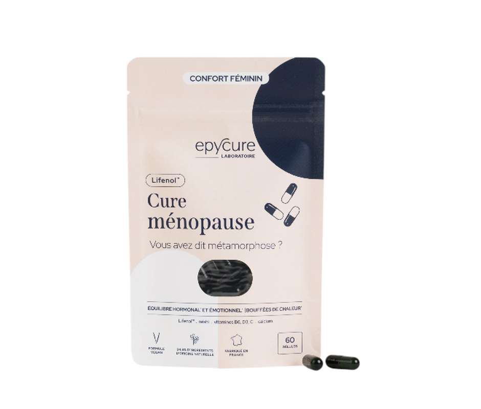 Le soutien hormonal pour vous aider à vivre pleinement votre ménopause. 1 mois de cure, soit 60 gélules. POUR QUI ? Ce produit est fait pour vous si vous ressentez un ou plusieurs de ces symptômes et que vous souhaitez aborder votre ménopause avec plus de sérénité (sans recours aux traitements hormonaux de substitution (THS)) : - Bouffées de chaleur et sueurs nocturnes, parfois soudaines et imprévisibles, qui peuvent survenir de jour comme de nuit. - Transpiration accrue, même au repos ou lors d’efforts légers. - Épisodes de nervosité, d’irritabilité ou de sensibilité émotionnelle inhabituelle. - Troubles du sommeil, comme des difficultés à s’endormir, des réveils nocturnes ou la sensation de ne jamais être vraiment reposée. - Sensation de fatigue générale, souvent accompagnée de maux de tête plus fréquents. - Sensibilité ou fragilité osseuse pouvant limiter les mouvements ou activités quotidiennes - Changements urogénitaux, incluant la sécheresse vaginale et les inconforts intimes pouvant affecter la vie sexuelle. BIENFAITS La ménopause est une étape naturelle de la vie d’une femme, une période de transformation, souvent ponctuée de bouleversements hormonaux, physiques et émotionnels qui viennent bousculer l’équilibre du quotidien. Longtemps passée sous silence, la ménopause mérite d’être comprise et accompagnée avec bienveillance. Nous avons donc choisi d’en parler ouvertement, sans détour ni tabou, et d’agir concrètement pour aider chaque femme à mieux vivre cette transition. La Cure ménopause est une approche efficace basée sur une synergie de plantes, notamment le Lifenol™ (un extrait de houblon breveté), de vitamines et minéraux, qui permet de cibler les principaux symptômes de la ménopause et ainsi rétablir l’équilibre du corps et de l’esprit. - Aide à réguler l’équilibre hormonal grâce à son action phyto-œstrogénique. - Atténue les bouffées de chaleur et les sueurs nocturnes. - Soutient le bien-être émotionnel et aide à lutter contre l’irritabilité et la fatigue. - Contribue au maintien de la densité osseuse. - Aide à réduire les troubles du sommeil. - Contribue à limiter la sécheresse vaginale. NOS INGRÉDIENTS L’ingrédient phare Lifenol™ est un extrait naturel de cône femelle de houblon titré en 8-prenylnarénine (8-PN), l’un des phytoestrogènes* les plus puissants. Le 8-PN peut se fixer sur les mêmes récepteurs que les œstrogènes, apportant un soutien hormonal naturel pendant la ménopause. Les phytoestrogènes sont des molécules végétales dont la structure est très proche de celle des oestrogènes, hormones féminines qui chutent à la ménopause et qui entraînent des bouleversements hormonaux importants. Les phystoestrogènes miment ainsi l’action de des oestrogènes.* Lifenol™ agit sur les symptômes les plus fréquents de la ménopause, notamment les bouffées de chaleur, les sueurs nocturnes, les troubles du sommeil et la fragilité osseuse. Ses effets ont été démontrés à travers 3 études cliniques rigoureuses dont : 1. 1 étude clinique sur les bouffées de chaleur et l’amélioration de la qualité de vie, réalisée sur 67 femmes ménopausées (45 à 60 ans) ayant 2 à 5 bouffées de chaleur par jour, en double aveugle avec placebo, pendant 12 semaines. Les résultats ont été mesurés en partie grâce à l’indice de Kupperman qui évalue 11 symptômes de la ménopause (bouffée de chaleur, transpiration, insomnie, nervosité, mélancolie, vertige, fatigue, douleurs musculaires et articulaires, maux de tête, palpitation cardiaque, sécheresse vaginales). Dès 6 semaines, l’étude a permis de démontrer l’efficacité du Lifenol™ sur la réduction des bouffées de chaleur et la qualité de vie globale des femmes. 2. 1 étude clinique sur la densité osseuse réalisée sur 100 femmes ménopausées (50 à 85 ans) en ostéopénie (faiblesse osseuse qui précède l'ostéoporose), en double aveugle avec placebo, pendant 48 semaines. La prise du Lifenol™ a été associée à du calcium et de la vitamine D3. Cette étude a notamment mesuré la densité osseuse via une analyse DEXA (examen au rayon X). Elle a démontré une augmentation significative de la densité osseuse (+1,8% vs J0). L’effet sur la densité osseuse est d’autant plus marqué avec le Lifenol™ chez les femmes n’étant pas carencée en vitamine D. *Pour les femmes carencées en vitamine D, la prise de 20 µg de vitamine D (quantité présente dans la cure ménopause) + 1 g de calcium (120 mg sont présents dans la cure) est requise pour améliorer la densité osseuse* L’efficacité par la synergie Pour une efficacité optimale, nous avons associé le Lifenol™, cet extrait de houblon étudié cliniquement, à la vitamine B6. Ensemble, ces deux actifs aident à soutenir et réguler l’activité hormonale. Le reishi, un champignon aux propriétés adaptogènes, agit sur la sphère émotionnelle et nerveuse, et contribue ainsi à réduire l’irritabilité ressentie pendant la ménopause. Il a été associé à la vitamine C qui favorise la réduction de la fatigue. Enfin, la vitamine D3 favorise l’absorption et l’utilisation normales du calcium et du phosphore et a été associée au calcium. Ils contribuent tous deux au maintien d’une ossature normale et à la réduction des inconforts articulaires.
