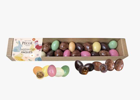La recette Jardin de Pâques de Maison Pécou rassemble une farandole de petits œufs fourrés aux teintes joyeuses. Sous leurs coques délicates se cachent des cœurs fondants et variés, pensés pour plaire à toutes les envies. À partager en famille ou à offrir, cet assortiment mêle plaisir des yeux et gourmandise, dans un esprit festif qui fait sourire petits et grands.